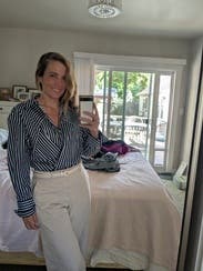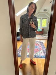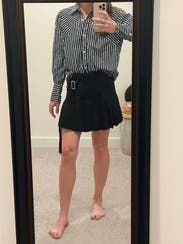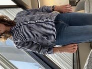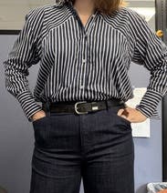 Love this modern pattern on a classic pinstripe! Consistently a S but this runs big. Should've rented XS. Super soft & easy to style but pleat in the back means it's kinda puffy if tucking into pants altho maybe just bc it's 1 size too big(??). This brand is always 💯 IMO!