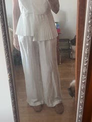 I loved this set. I’m tall and usually the cropped shirts are too short but this was just right. I didn’t feel like I was dressing under my age. The back out is a perfect touch. Pants have good length for tall ladies. I wore a thin pair of white bikers underneath. Great with sneakers or heels. I wore this set three times.