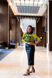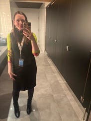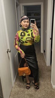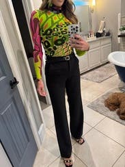 My first but not last Fuzzi rental. The colors on this are just so interesting. I played up the pink with a pink pointed pump. I felt super stylish! The top is lightweight and comfortable, easy to tuck in as it’s very thin.
