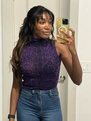 The turtleneck with sleeveless style is super versatile and can be worn with a jacket. I paired it with wide legged black pants and a belt and was perfect for vacation. Also wore it with jeans and a leather jacket. Very stretchy and would fit a variety of bust sizes. The print is dark purple and black. Best with a black bra