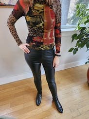 Wore this top twice, once with leather pants and with a leather skirt and tights. Both were super cute outfits! Got so many compliments. Not sheer at all and just tight enough.