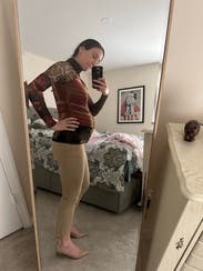 Ignore that my pants are too short - hard to find long pants these days. Very lightweight, can be worn in any weather if layered. Wore with a cardigan to work. Didn’t need a tank top under, just a skin colored bra - there are 2 layers of mesh that cover you up well. Going to wear it out with friends too!
