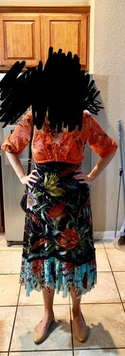I wore this to work on Dia de Los Muertos and also had my blood drawn that day. Paired with short Paul Green ankle booties but felt comfortable and pretty all day.