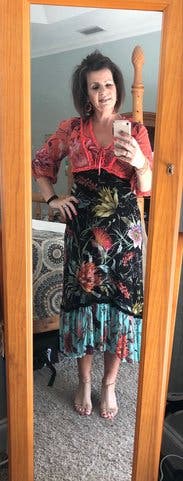 I simply love this dress. The fit is flattering. Beautiful colors and soft stretchy fabric.