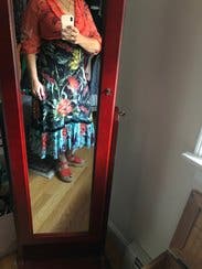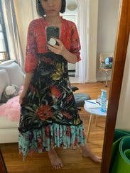 This is a great piece! The colors are gorgeous and I love the print mixing. The fabric is a very light-weight mesh that hangs well and travels well (no wrinkles). It was more form-fitting than expected, so I opted not to wear it to a dinner date and chose something that felt more easy. I wonder if sizing up would allow it to hang rather than cling. It's gorgeous so I might try a bigger size next time...