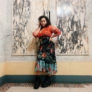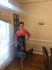 Rented for a NYE "Havana Nights" theme party I had to work. Love this dress, so many compliments!! Pear shape gals: this one's a winner, forgiving on the bottom!! Was able to wear a low-cut plunge-style bra. I'm not busty (32C), neckline was work-appropriate for the party. If you are busty I imagine it could be more revealing. Lower half lined with full underskirt. Incredible movement with that bottom ruffle & light, flowing, semi-sheer fabric! RTR J Crew Floral earrings paired perfectly.