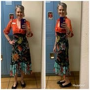 This is one of the most flattering dresses I've ever seen. It has a lot of stretch to provide a perfect fit, but somehow makes any little lumps or imperfections disappear! It is a bit low cut at the bust but not so low that I felt uncomfortable or in danger of having a wardrobe malfunction. Even though it has long-ish sleeves and length, it is a very breathable fabric that does not wrinkle - this would be perfect for taking on a tropical vacation! Beautiful bright colors, lots of fun!