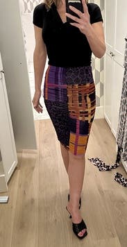 Very fitted sexy skirt, great for date night. The cool pattern just adds to it. Wore with a black sleeveless high neck blouse and booties, very cute and lots of compliments from boyfriend. Loved it!