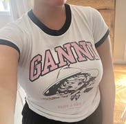 When I first tried this shirt on, I was a little embarrassed because it is tight fitting, and I am an older woman. But it was so refreshing to have a shirt fit a woman’s body rather than a boxy shaped T-shirt. I did rent another Ganni shirt in medium (this one was small) and it was still very cute but I think I made a mistake because the small just has a better fit