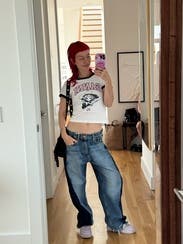 Fit is definitely 90’s fitted baby tee so you might consider sizing up if you want a looser fit. Note it won’t be a normal-length tee regardless of the size you order. This was so fun for a Bratz-y look. Would love to rent again in the fall with the cute witch on the front.