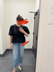 Puff sleeves added something! Wore with black crop bra underneath, elevated jeans outfit.