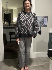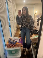 Mixed emotions! The charcoal gray and very soft dusty rose pink are an incredible color combo, that render the whole thing somehow neutral even though it’s an animal print! But it’s pretty unflattering even allowing for it to be a big cozy sweater. I guess you just need to lean into that mindset. Somehow it is soft and itchy at the same time so if you are sensitive, be aware. I have a lumpy size 8/10 torso and this small/medium had lots of room. 😊