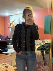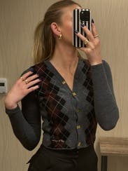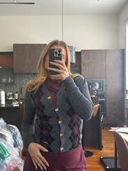 I adore the button details. Argyle never goes out of style, in my opinion. This runs a little small. I could have gone with a small. I ended up not using all of the buttons. But it was still super cute and comfortable. Very well made piece.