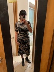 Cute with combat boots, flats or pumps. Form fitting along the hits and the ruching is great for the belly area