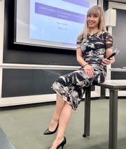 Fun to wear, body skimming, modern print. Does not feel dowdy.
