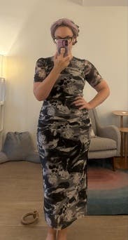 Wore this sleek number to a party and felt effortlessly cool. The print is bold and artsy, perfect for turning heads. That said, it ran a bit large on me—especially in the waist and hip area—so I recommend sizing down for a more tailored fit. The length hit just right with heels, and the material had a soft stretch that made it comfortable to dance and move all night. Loved the vibe, just wish I had gone one size smaller!