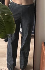I loved these trousers- I sized up for a low rise relaxed look and found the style very flattering on me. The material is light but still good quality. Subtle pinstripe patterning is very very chic. Definitely long on my (styled like a puddle jean with heels) but used fashion tape to faux hem during the day.