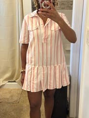 Wore this to work and for brunch during an extra warm spring week. I wore it loose but it could potentially be styled with a belt for a more fitted look. Super cute, the pleats are perfectly on trend, and the stripes are jaunty and perfect for summer.