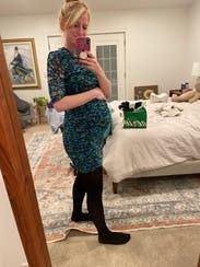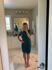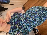 I wore the skirt version of this dress to my engagement party last summer so I knew the material. It’s a fun print with a lot of stretch- (I’m 29 weeks pregnant in this photo). I could squeeze into my pre pregnancy size here. Great dress