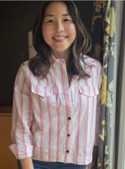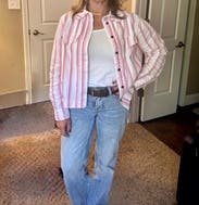 I love the ombré pink stripes on this shirt, which make it more unique than a classic striped shirt. The ruffled collar is also a unique feminine detail, which isn’t really my style, but it’s pretty subtle. The fit is oversized and boxy, with a relatively short length. The fabric is thick and not see-through, but it wrinkles very easily.