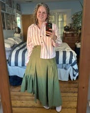 Such a fun shirt! It is oversized so I ordered a small which was perfect for the look I wanted. Cute details from the Peter Pan collar and top button to the side gusset panels. Always surprises me after 8 years as a RTR member, when people stop to compliment what I’m wearing. This color is a cheery eye catcher.