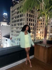 Wore this for a night out in Vegas. I put fabric tape on the side with no strap because if I had to pull the dress down I didn’t want to flash someone. I loved it with the oversized blazer!