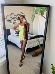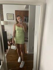 Excuse the duck face 😂 Almost didn’t wear out because it was so tight on my more robust stomach but my friend convinced me it was hot and I just went for it. I didn’t regret it!! Love not wearing a bra (I’m a B cup.) Comfy! Pretty short so pulled down over my non-existent butt fairly often but overall, a win!