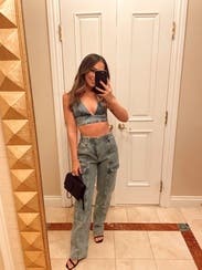 Was hesitant about this since denim is a tricky fabric but this fit like a glove on me. I would suggest sizing up if you have anything over an A cup. Looks great with the perfect denim wash jeans. I LOVED this look. Definitely buying!