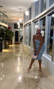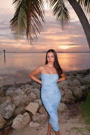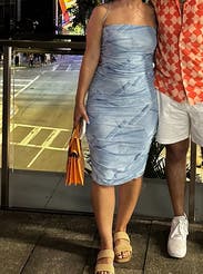 This was a great dress. It doesn’t wrinkle and is easy to throw in your suitcase. I’m 5’10 and this dress hit mid shin so keep in mind it will be long if your are petite. It is stretchy and you can kind of scrunch it up if you want it to fit shorter. Strapless bra friendly.