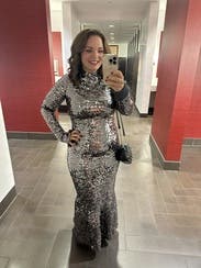 If you want to feel like a million bucks and wow anyone and everyone… this is our dress! My husband was drooling all night. And everyone else was so complimentary of it. Including someone calling me a bombshell… talk about a mood booster!! Now for the fit details… It’s thick and heavy but not uncomfortable in any way. The neck was a little tight (I don’t like things around my neck so I knew this would be a challenge anyway.) but I left it unzipped right before the seam. So with that plus my hair no one noticed. I went with the extra large simply because of body image issues. I could have fit the large but ya girls has a mom pooch that isn’t her fav. The material is very stretchy but the sequins are not forgiving. They will show all lumps and bumps. The length hit right at the top of my foot which was just fine with me. I didn’t have to worry about walking with the length and it showed off my fun shoes too!! It was absolutely one of my favorite rentals so far! It made this mom feel sexy!!