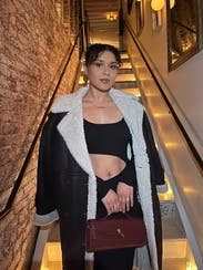 I wanted a small but only could get a medium, and it worked. It runs true to size, so I went with an oversized look. The coat is super warm, and the entire inside is shearling so it’s very cozy. I wore all week in NYC in the winter and loved it.