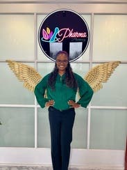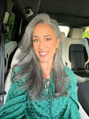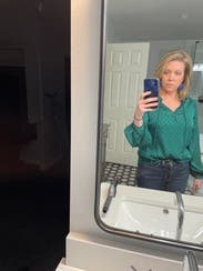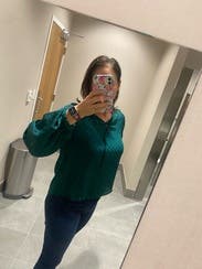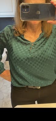 This was such a flattering top. The color is really pretty. The polka dot design gives some fun dimension to the top.