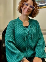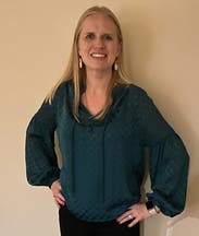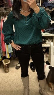 This blouse is a pretty rich green color and good but not great since there is a seam in the arms with no stretch so it was a little uncomfortable since my arms are a little thicker. Wore once to work holiday lunch.
