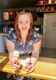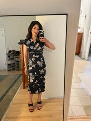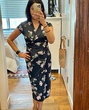 Loved this rental, will definitely rent again. You could definitely size down if you wanted a more form fitting dress dress, but as it is, the little bit of extra give in this dress made it work friendly for my very curvy figure. Ruching is flattering, and the faux wrap was high enough to be appropriate on my large chest. I did have to adjust the wrap on the chest a few times.