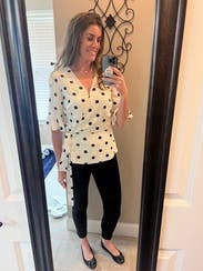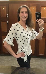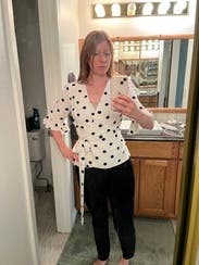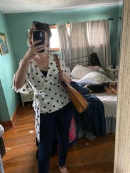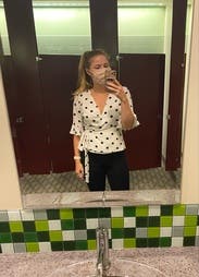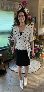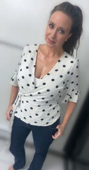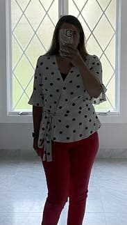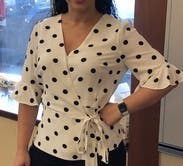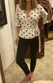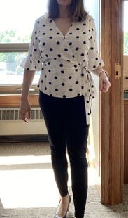 I loved this shirt and felt great in it all day at work, but the wrap style doesn't work great for those of us with smaller breasts. The waist and length and sleeves all fit perfectly, but the bust was a wide open gaping hole. I used double-sided fashion tape and secured the top after taking the photo and had an easy-breezy day (worked perfectly!), but it took some time for me to figure out how to wear this shirt.