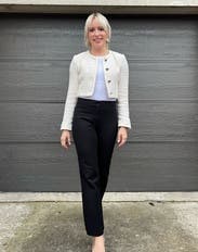 I really loved the fit of this jacket and found it to fit true to size. It is a little more cropped than your traditional lady jacket but overall a lovely fit. The fabric has a subtle sparkle to it, so it could easily be dressed up for the holidays.