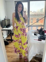 This dress is more yellow green in person than yellow - I'd call it chartreuse. I didn't love the color but it was cute enough overall and fun and bright. Not the most flattering dress as it made me look a bit hippy and wider than usual, but still cute enough to wear. And very comfy! Good for a big dinner bc plenty of room underneath. The neck detail is pretty. Length good for petite - it was full length on me at 5'1"