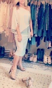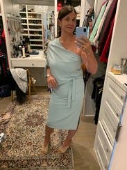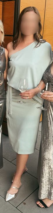 Fashionable assymetric design hid my middle-aged belly, and was tasteful yet sexy as I’m larger chested. High-quality jersey knit that smooths out lumps & bumps, but did not feel tight at all. Color is gorgeous. I’m short, and wore flats for a lawn wedding, so it was slightly long on me.