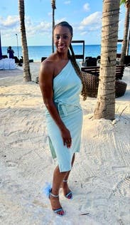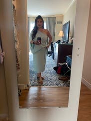 First, RTR is easy and convenient from receiving your items to returning them. Second, this dress was absolutely stunning. I have narrow hips and big boobs, and this dress fit me perfectly. I wanted my handsome date’s attire to complement mine, so I planned to get him a pastel blue tie. My daughter convinced me the dress was more of a greenish blue, maybe a pastel robin’s egg blue, and she was right! I highly recommend RTR, this dress, and the cuff I rented to go with it!