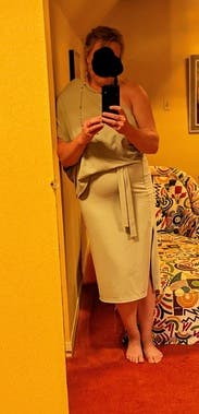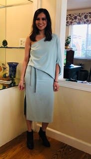 I don't usually go for asymmetrical dresses, but the color pulled me in! The top was very loose and forgiving, but the bottom was a bit snug if you're curvy. I definitely needed some shapewear, and the shorts kind was a little tricky as the slot came up rather high. It was worth the trouble though!