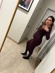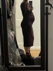 I wore this for WFH and then out to a Broadway show at 31 weeks. I felt really cute and date-appropriate in it (not easy at 7+ months!). It was really comfy once I had it on, but be aware that getting it on + going to the bathroom is a challenge — this is TIGHT fabric (though plenty thick enough to smooth out undergarment lines, which I appreciated!). I’ve rented a M in other Hatch items and the L just fit here. Also, note neckline is pretty low — wouldn’t wear it to the office and even on Zoom I felt a bit too open. Am considering renting again for my shower.