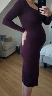 I really liked the material of this dress. Its super soft and comfortable however its very tight to get on and definitely felt like I was stretching it out over my bump (32 weeks)