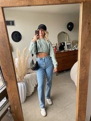 This sweatshirt is definitely a bit more cropped than I prefer but liked it paired with high waisted jeans! Also sadly not as soft as I expected but loved the color so I give it brownie points for that (: