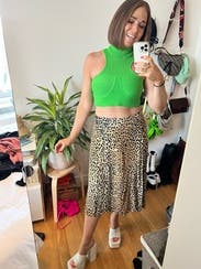 Such a cute top! Felt like a hot mama. Great length for high waisted bottoms. Color is gorgeous