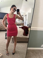 We are obsessed with this hot take on the classic bodycon dress by Hervé Léger featuring sultry cutouts and a heart-shaped bodice.