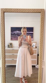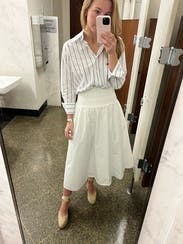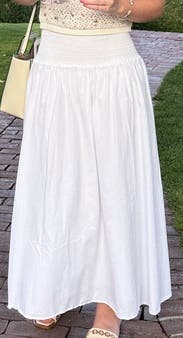This is a very high quality skirt. It has a lightweight, breathable lining that eliminates the everything-showing-through-white worries. It has a poof to it, which is fun, but I wore it with a bright, lightweight fitted cardigan (not in the photos so you can see the skirt better) and I was giving off 50’s housewife on Bridge Club day vibes. The elastic kept riding up to fit around my waist instead of further down my hips but I think that’s what made it so slimming. This would look great with a structured crop that shows just a bit of the cinching on the skirt.