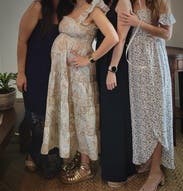 Flowy dress that fits over any baby bump. Wore this dress from 28 - 32 weeks and it was perfect.