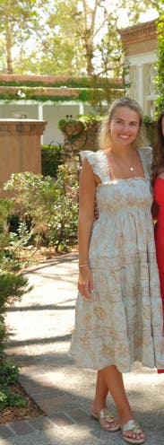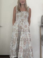 The Hill House Home Floral Ellie Nap Dress is a breezy midi that combines a smocked bodice with a tiered skirt for effortless comfort. Pair it with sandals and a woven bag for a relaxed, daytime look.
