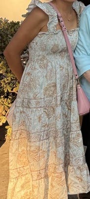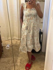 Super flattering with the stretchy bust and pretty shoulders. Lightweight and flowy skirt with plenty of room to eat. Wore it to church, to meals, and on a boat!