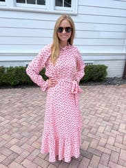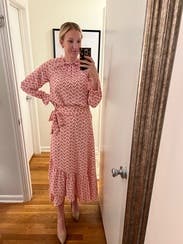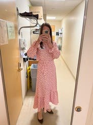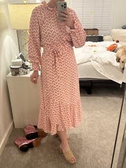 Probably could have sized down, but the small worked. Comfortable and flattering. A thicker wrinkle resistant fabric that would be good for spring. It’s definitely long, so if you’re petite keep in mind. I thought the background of the print was white but it’s actually pink.